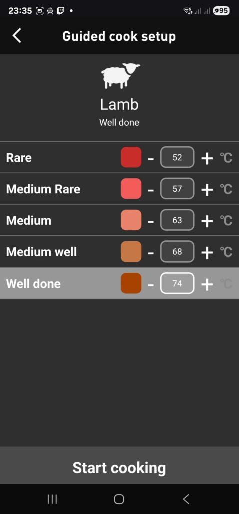Brukeropplevelsen er enkel og fleksibel: Appen kobles trådløst til termometeret og gir deg varsler når ønsket temperatur er nådd – ingen gjetting eller unødvendig åpning av lokket. Den keramiske delen av håndtaket gjør at den er trygg og praktisk å håndtere selv ved høy varme, og det magnetiske stativet lar deg feste enheten til grill eller ovn.