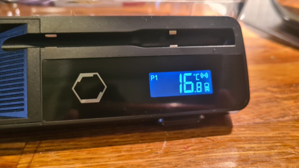 Måler 0 til 100 grader i kjernen og opptil 300 grader i omgivelsene. Proben er robust med keramisk håndtak. Enheten er IP65 klassifisert mot vann og støv. Batteriet på 500 mAh lades fullt på ca. 20 minutter via USB C og varer opptil 72 timer. Kompakt design (dock 162x52x26 mm, probe 143×55 mm) og vekt på ca. 115 g gjør den enkel å oppbevare. Magnethenger på dokken gjør det praktisk å feste den på metallflater på kjøkkenet.